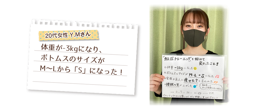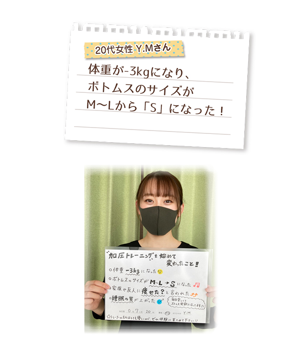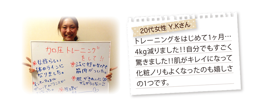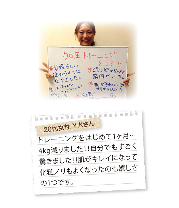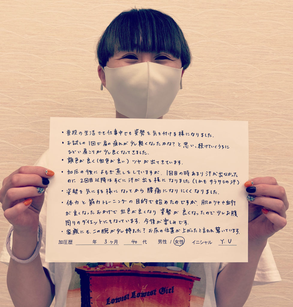 「今日もやってよかった!」スタジオをお帰りの際はみなさま笑顔でそうおっしゃいます。加圧をやった後は達成感で一日がとても充実するようです。