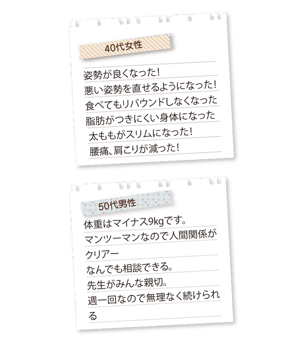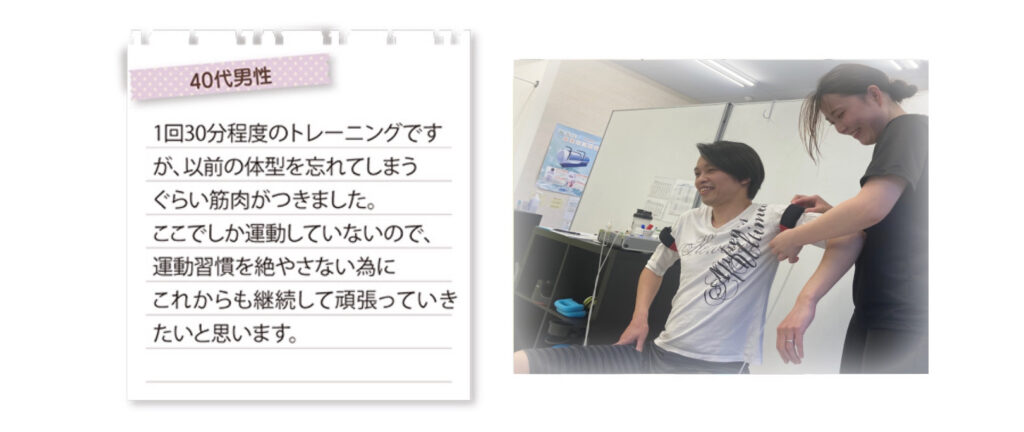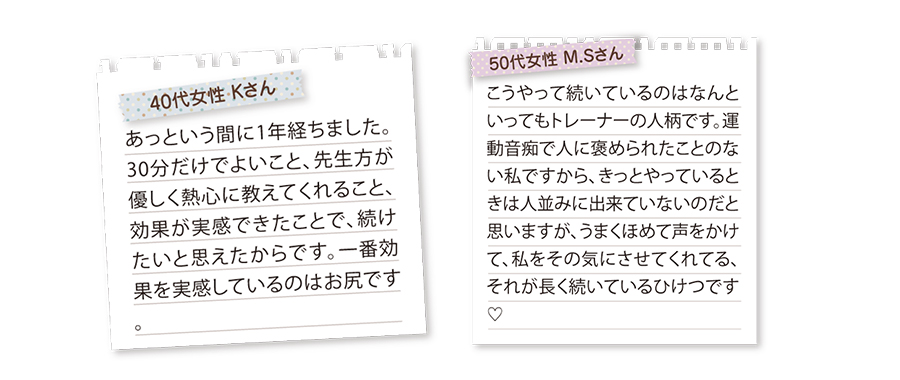「トレーニングの間隔が空くとカラダが重い」「やらないと気持ち悪い」というお声もよくいただきます。何らかの理由でトレーニング間隔が空いた時とのギャップで、逆に体力の変化を実感されるそうです。