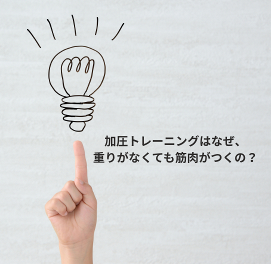 カラダデザインの加圧トレーニングは低負荷(ウエイトトレーニングの1/3程度の重さ)で行います。だから関節や腱に極力負担をかけず、安全に筋肥大を狙うことができます。