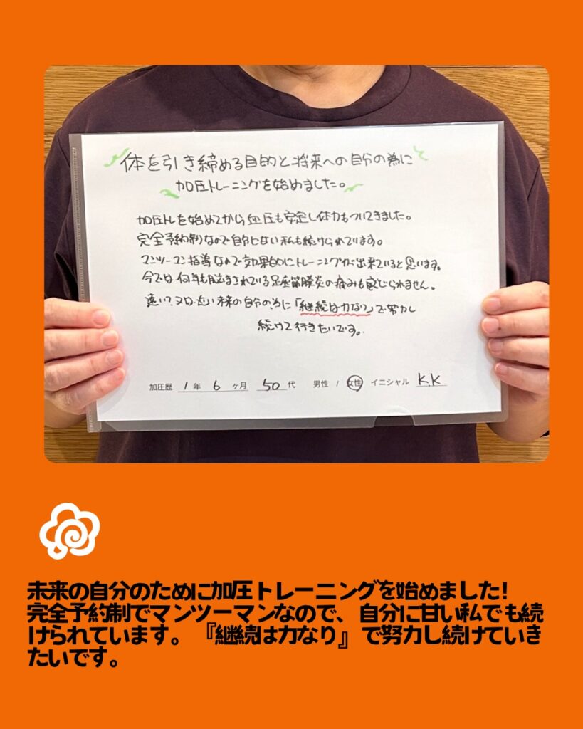 KKさん 50代女性 加圧歴1年6ヶ月「何年も悩んでた足底筋膜炎の痛みも感じられません」