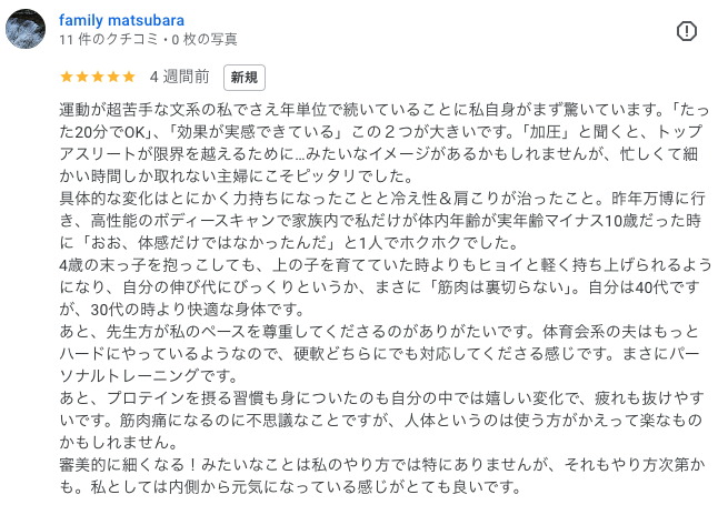 運動が超苦手な文系の私でさえ年単位で続いていることに私自身がまず驚いています。「たった20分でOK」、「効果が実感できている」この2つが大きいです。「加圧」と聞くと、トップアスリートが限界を越えるために…みたいなイメージがあるかもしれませんが、忙しくて細かい時間しか取れない主婦にこそピッタリでした。