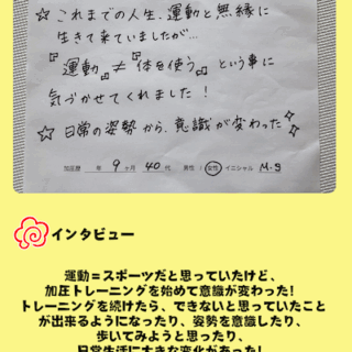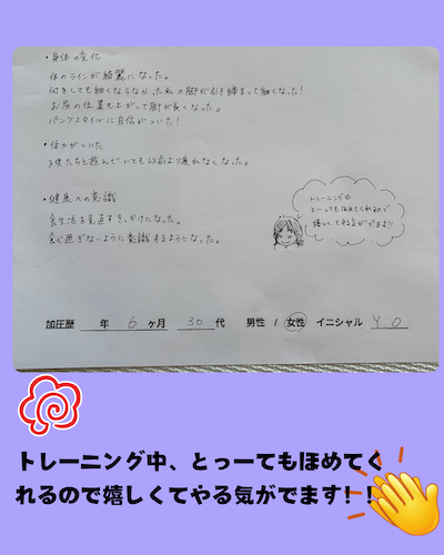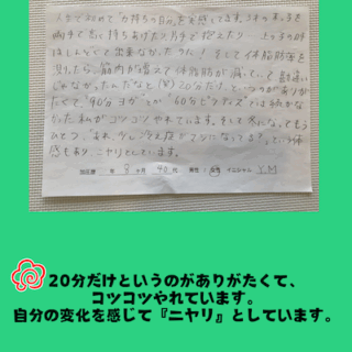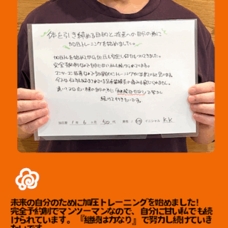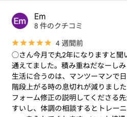 EMさん ◯さん今月で丸2年になりますと聞いて、いつの間にか通えてました。積み重ねだなーしみじみでした。 自分の生活に合うのは、マンツーマンで日時予約な所でした。階段上がる時の息切れが減りました。 トレーニング中のフォーム修正の説明してくだ...