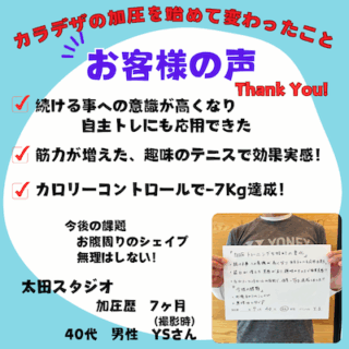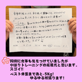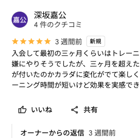 深坂嘉公さん 入会して最初の三ヶ月くらいはトレーニングがキツくて 嫌にやりそうでしたが、三ヶ月を超えたあたりから筋肉が付いたのか カラダに変化がでて楽しくなります。 トレーニング時間が短いけど効果を実感できます。 オーナーからの返信 深坂さ...
