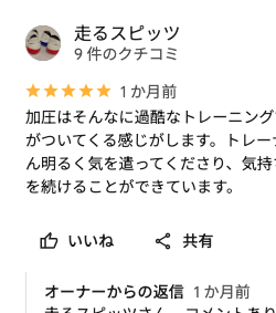 走るスピッツさん 加圧はそんなに過酷なトレーニングではなくとも、筋力がついてくる感じがします。 トレーナーの方々はみなさん明るく気を遣ってくださり、気持ちよくトレーニングを続けることができています。 オーナーからの返信 走るスピッツさん、コ...