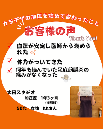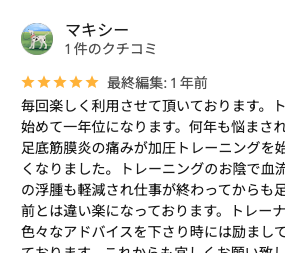 マキシーさん 毎回楽しく利用させて頂いております。 トレーニングを始めて一年位になります。 何年も悩まされていた右足の足底筋膜炎の痛みが 加圧トレーニングを始めてから出なくなりました。 トレーニングのお陰で血流も良くなり足の浮腫も軽減され...