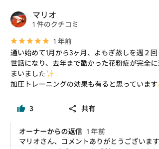 マリオさん 通い始めて1月から3ヶ月、よもぎ蒸しを週2回くらいお世話になり、 去年まで酷かった花粉症が完全に治ってしまいました✨ 加圧トレーニングの効果も有ると思っています👍 … オーナーからの返信 マリオさん...