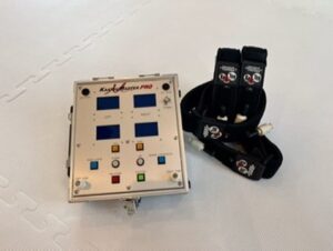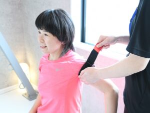 加圧トレーニング中は、腕と脚の付け根に専用のベルトを巻き、血流を制限しながらトレーニングを行います。