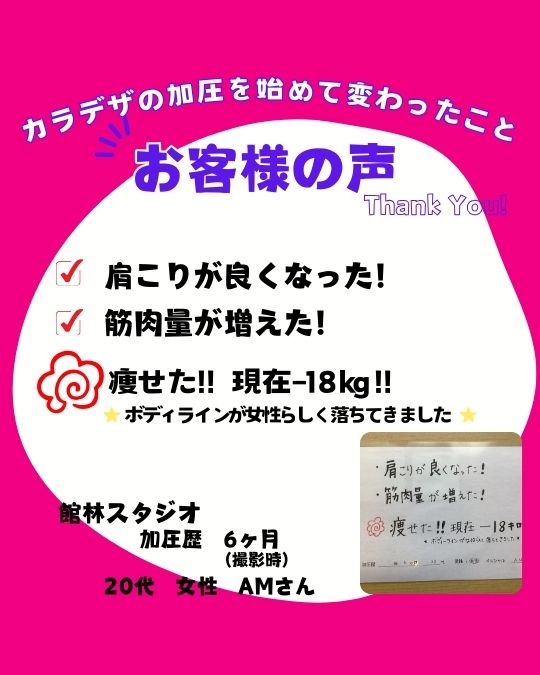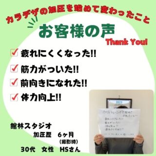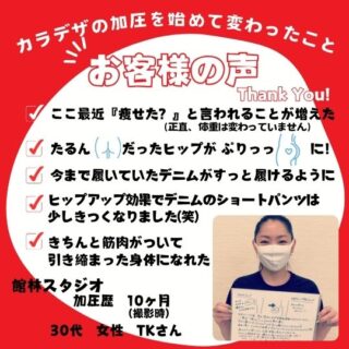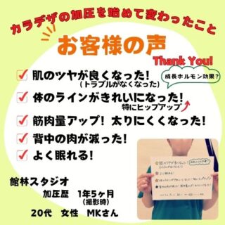 Kさん 40代 女性 加圧歴 2年 マンツーマンでスタッフの方が丁寧に教えてくれます。 最初の頃は全然ついていけなくて、キツかったですが、回を重ねるごとに、体が動くようになり、 体も引き締まってきました。 週1回で短時間で済むので、無理なく...