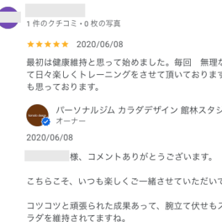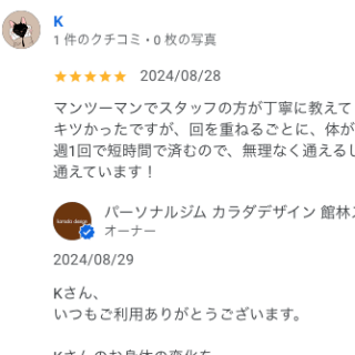C・Tさん 最初は健康維持と思って始めました。 毎回 無理なく指導され気がついたら筋肉もついてきて 日々楽しくトレーニングをさせて頂いております。先生達の対応も良いのでお陰様といつも思っております。 オーナーからの返信 C・T様、コメントあ...