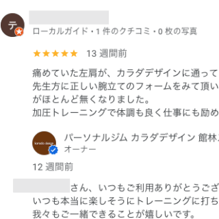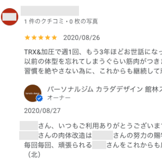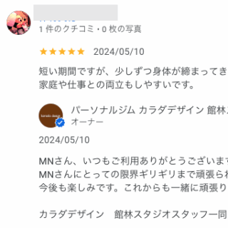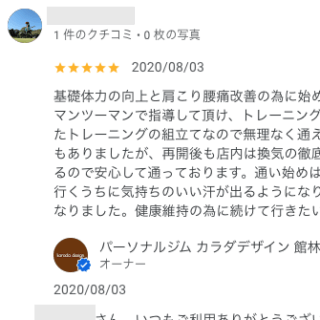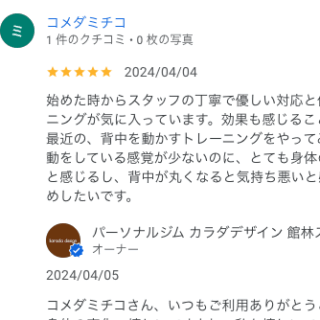 M・Nさん 短い期間ですが、少しずつ身体が締まってきている気がします。 時間も短時間で済むので、家庭や仕事との両立もしやすいです。 オーナーからの返信 MNさん、いつもご利用ありがとうございます。 MNさんにとっての限界ギリギ...