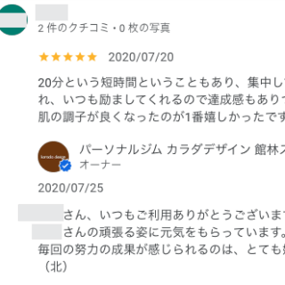 M・Kさん 20分という短時間ということもあり、集中してできます。 マンツーマンで丁寧に対応してくれ、 いつも励ましてくれるので達成感もありつつ楽しく続けられます^^ 肌の調子が良くなったのが1番嬉しかったです。筋肉もつきました! オーナー...