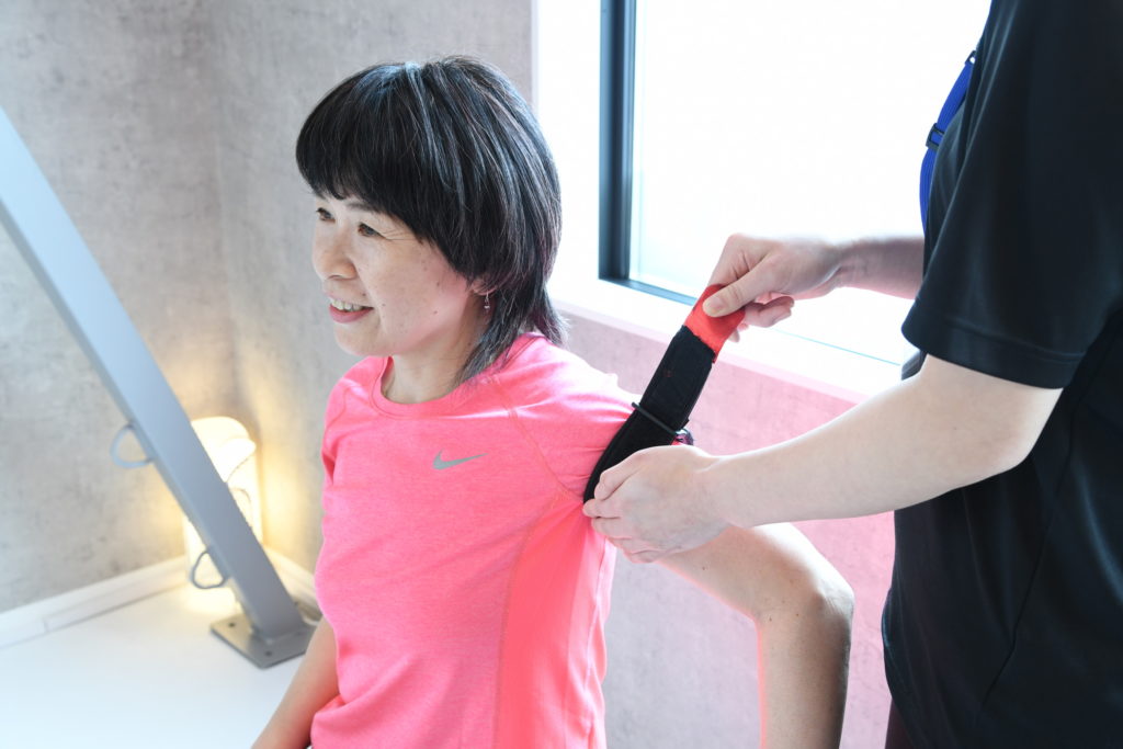 加圧トレーニング中は、腕と脚の付け根に専用のベルトを巻き、血流を制限しながらトレーニングを行います。